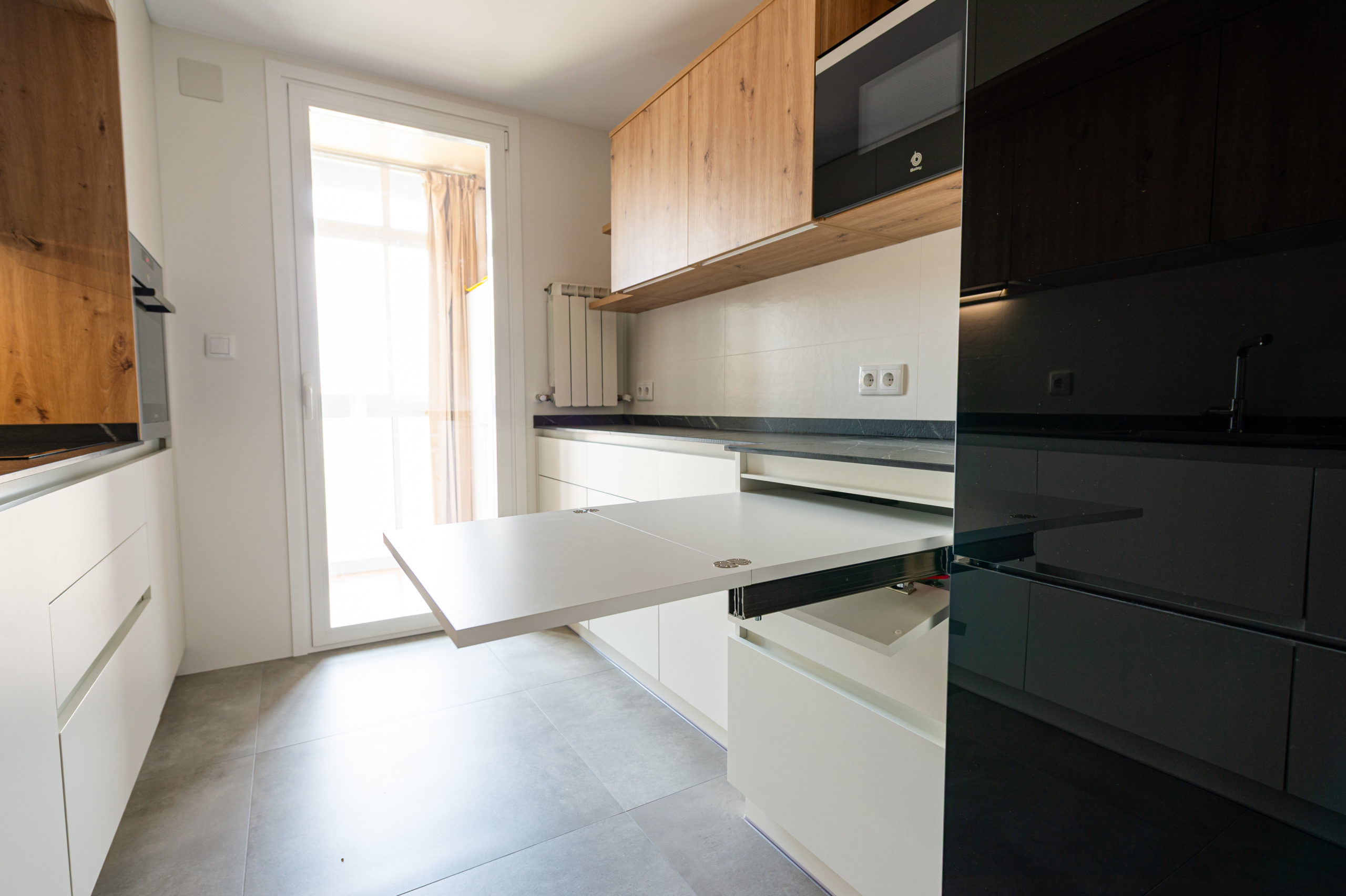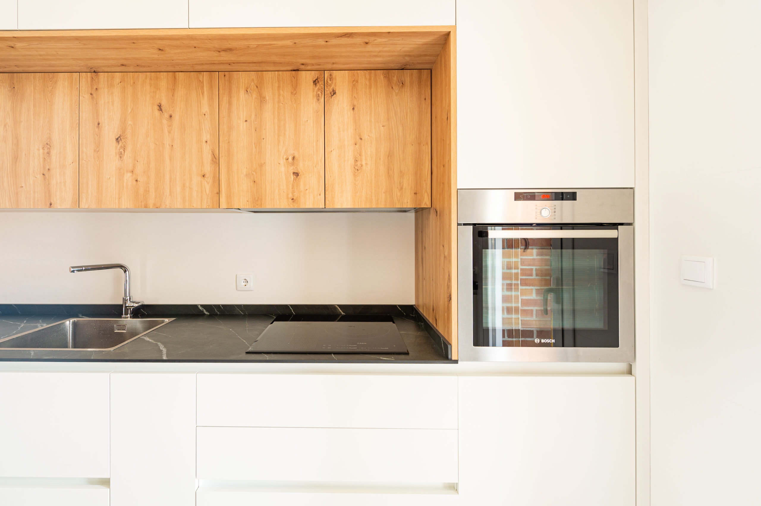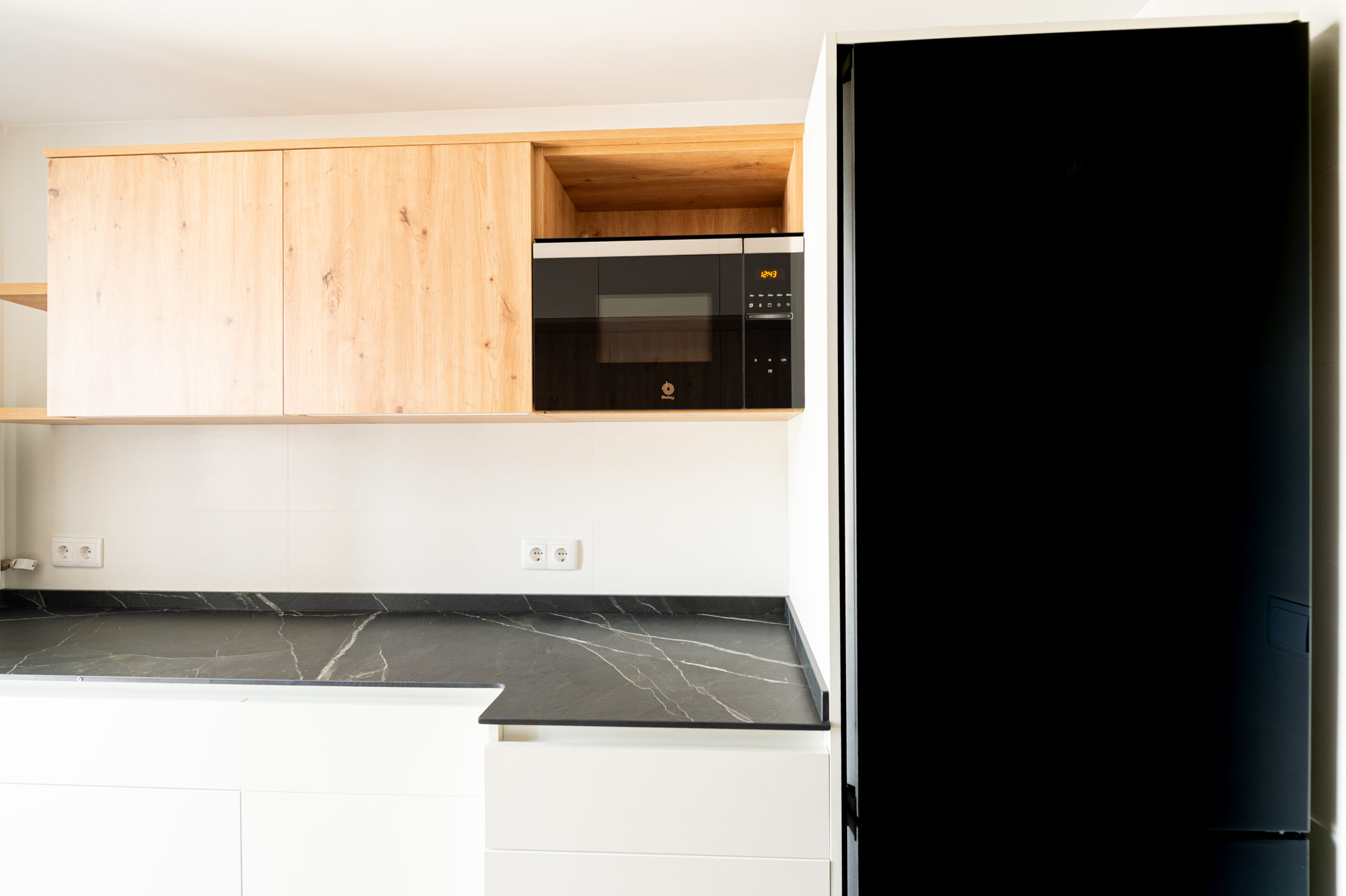 En cuanto a la composición, el primer frente de la cocina —con distribución en puente— acoge la zona de fregadero y cocción, integrando también el horno y el almacenamiento superior en Roble Real. El segundo frente, con disposición en “L”, incorpora el frigorífico en columna, el microondas en mueble alto y un módulo bajo con una de las soluciones más prácticas del proyecto: una mesa extraíble incorporada al mobiliario.