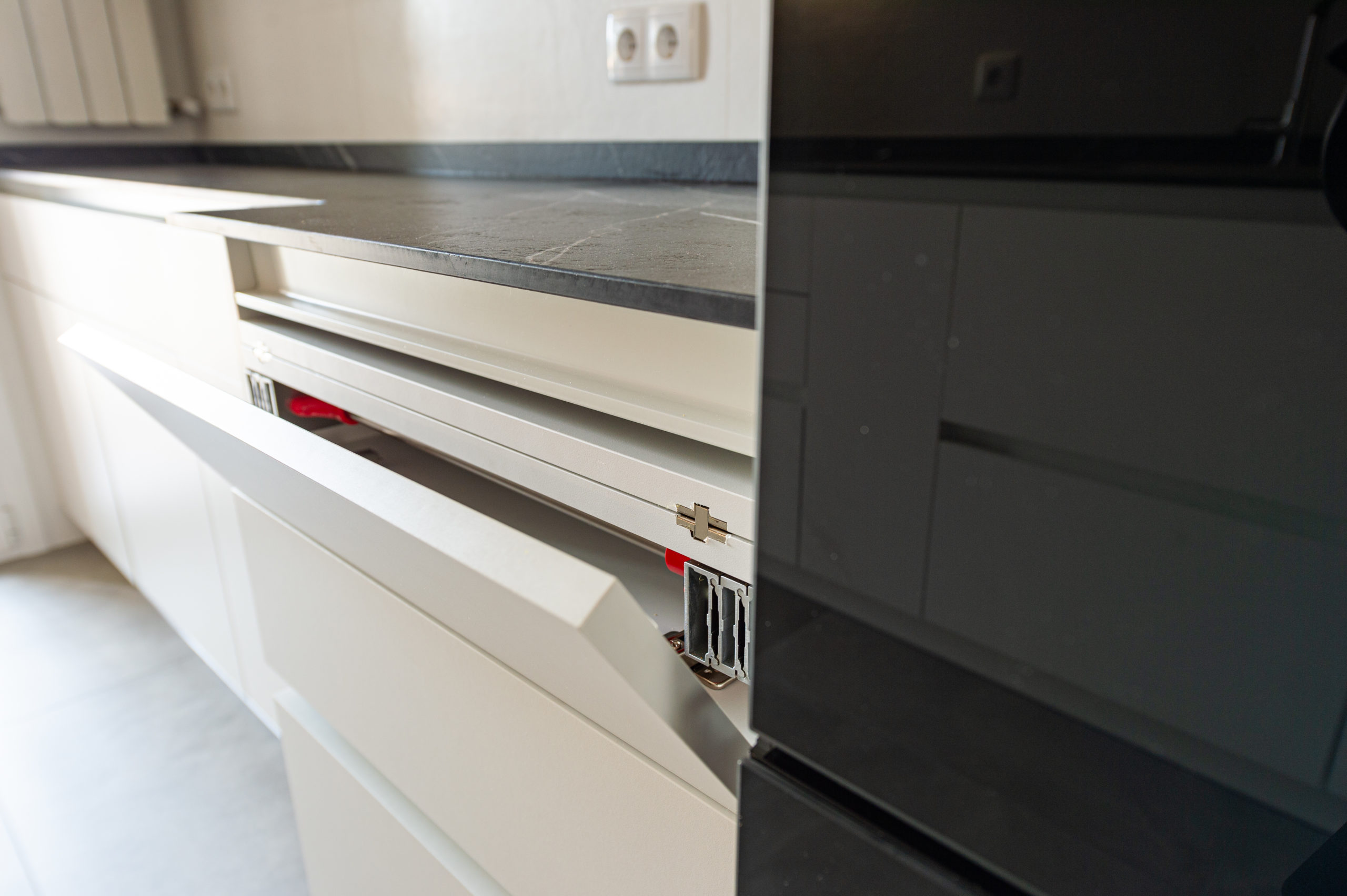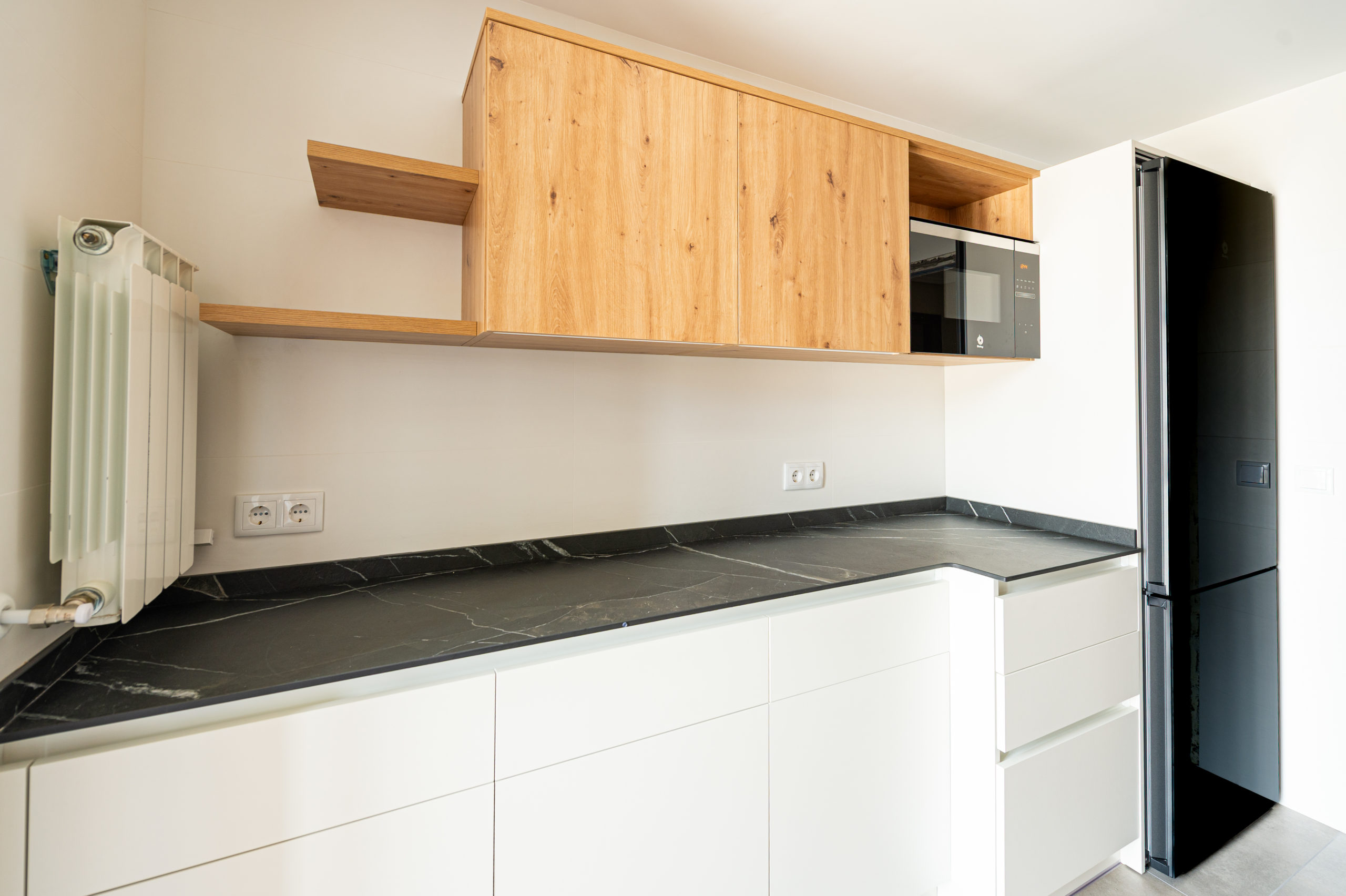 La combinación de encimeras oscuras con vetas suaves, el contraste entre madera y blanco, y la limpieza formal de las puertas sin tirador crean un ambiente elegante y contemporáneo. Además, el interiorismo de los herrajes internos de la cocina es en acabado antracita, aportando un toque distintivo y sofisticado, coherente con el nivel de detalle que define toda la cocina.