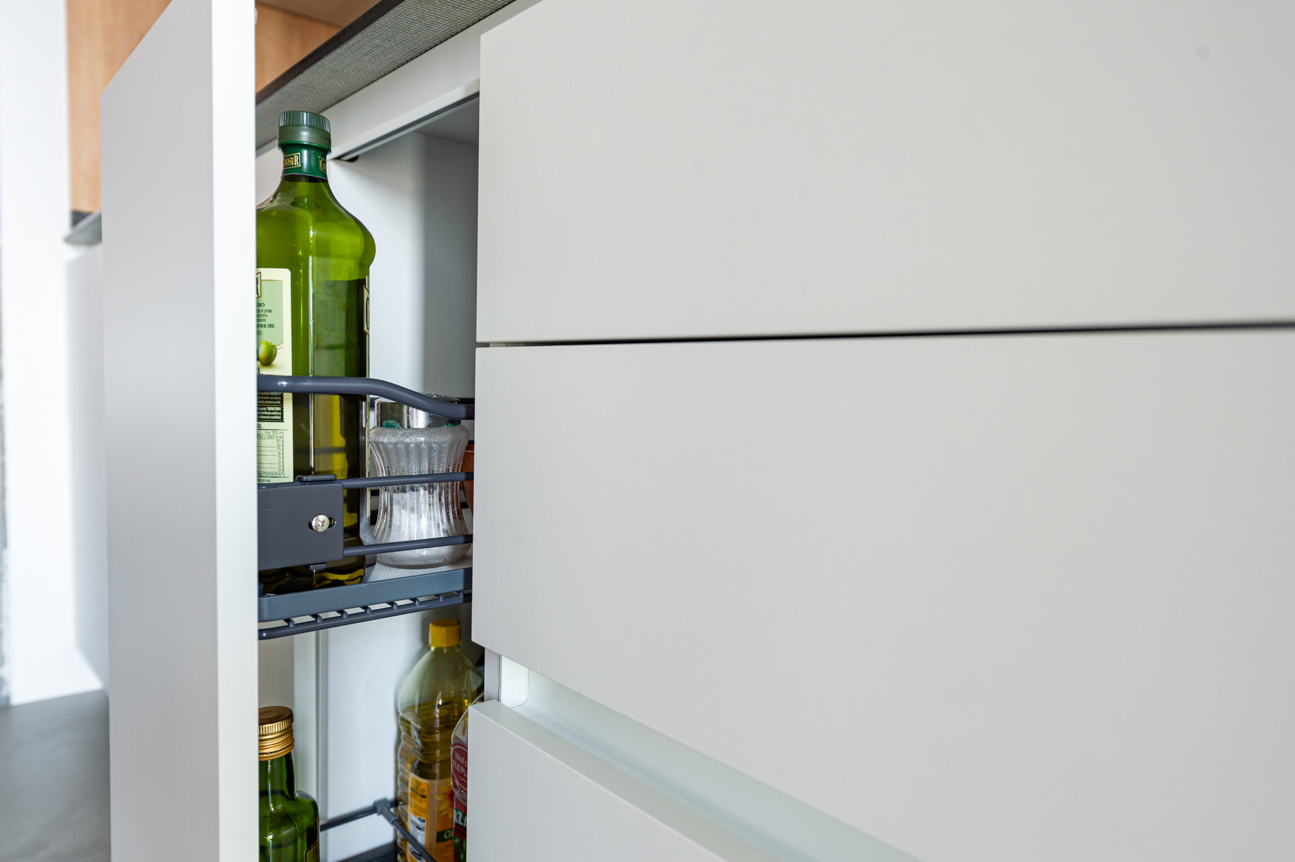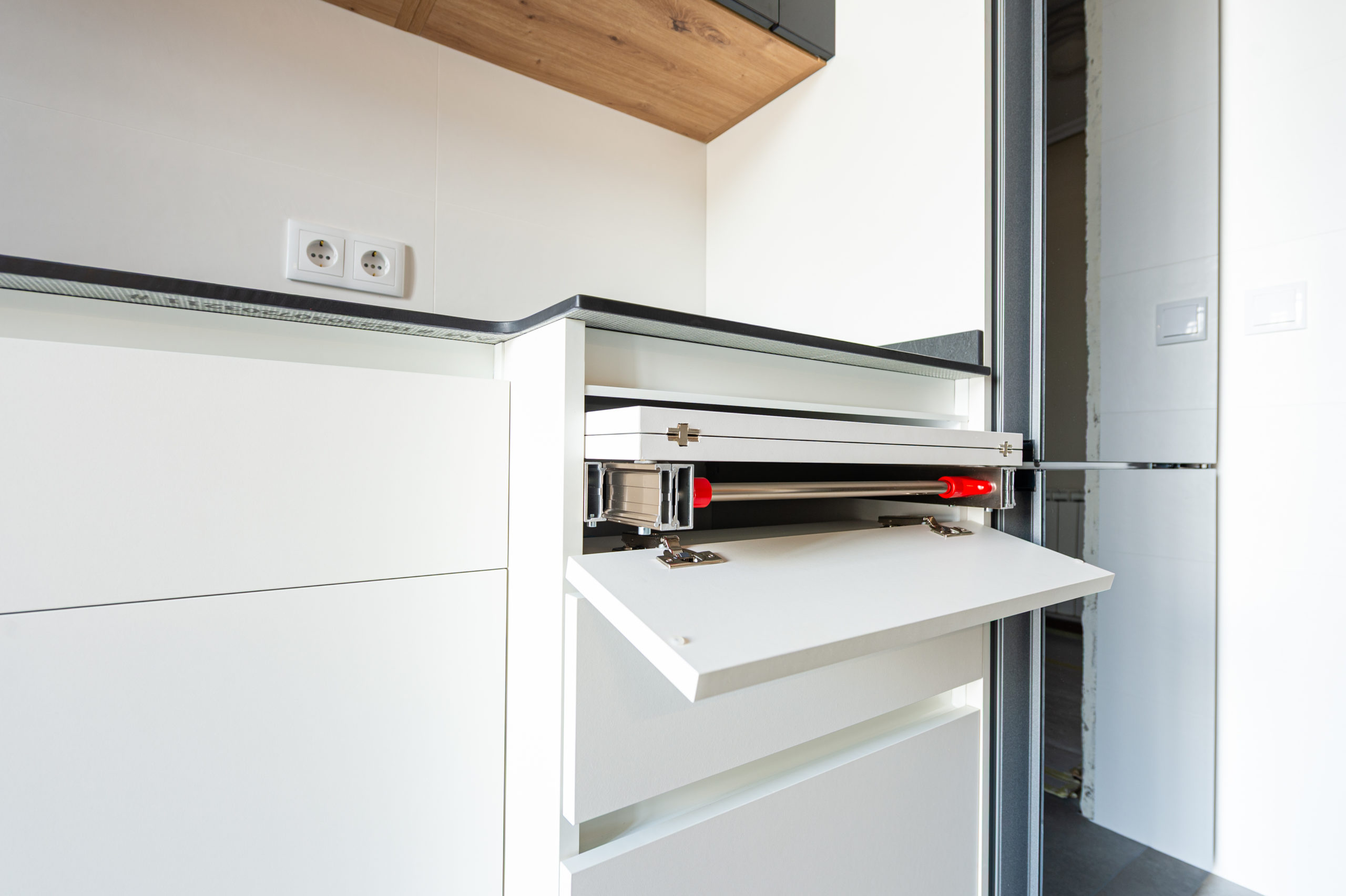 Este herraje permite extraer una mesa peninsular desde un cajón, ofreciendo una superficie de apoyo o comedor auxiliar cuando se necesita, sin ocupar espacio de forma permanente. Se trata de un sistema robusto y estable, con bloqueo lateral y una capacidad de carga de hasta 60 kg, adaptable a módulos de 60 a 120 cm de frente.