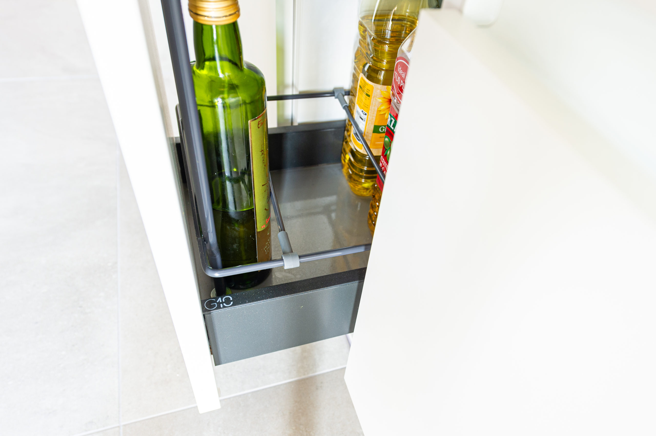 Uno de los detalles más característicos de este proyecto es el sistema de apertura mediante gola lacada en el mismo tono Blanco Porcelana, un acabado que unifica estéticamente el conjunto y refuerza la sensación de continuidad entre frentes. Este tipo de soluciones, poco habituales en el mercado, reflejan la atención al detalle y la calidad constructiva que distingue a G10 Muebles.